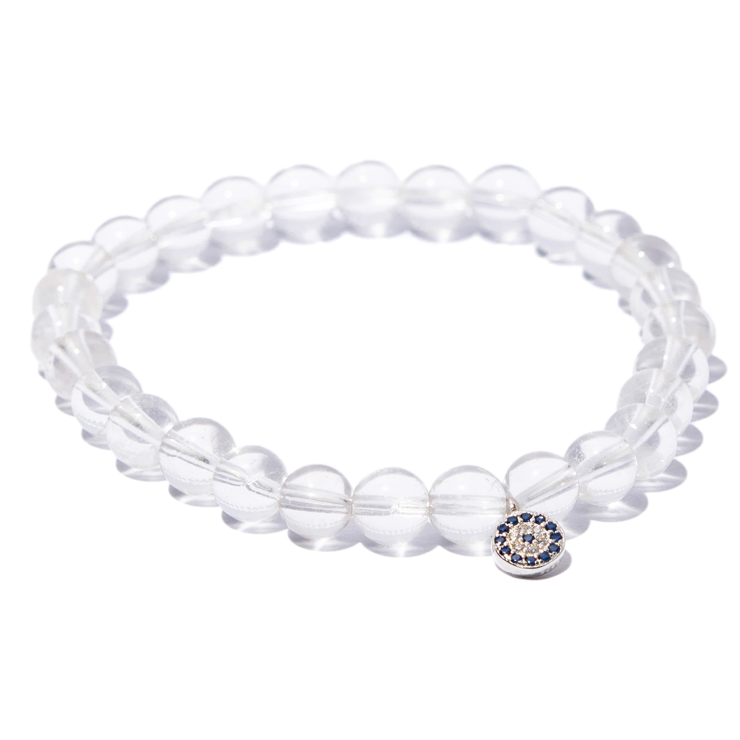 A Crystal Quartz Evil Eye Charm Bead Bracelet combines the metaphysical properties of clear quartz with the protective symbolism of the evil eye charm. Here’s a breakdown of the potential benefits of wearing such a bracelet:
